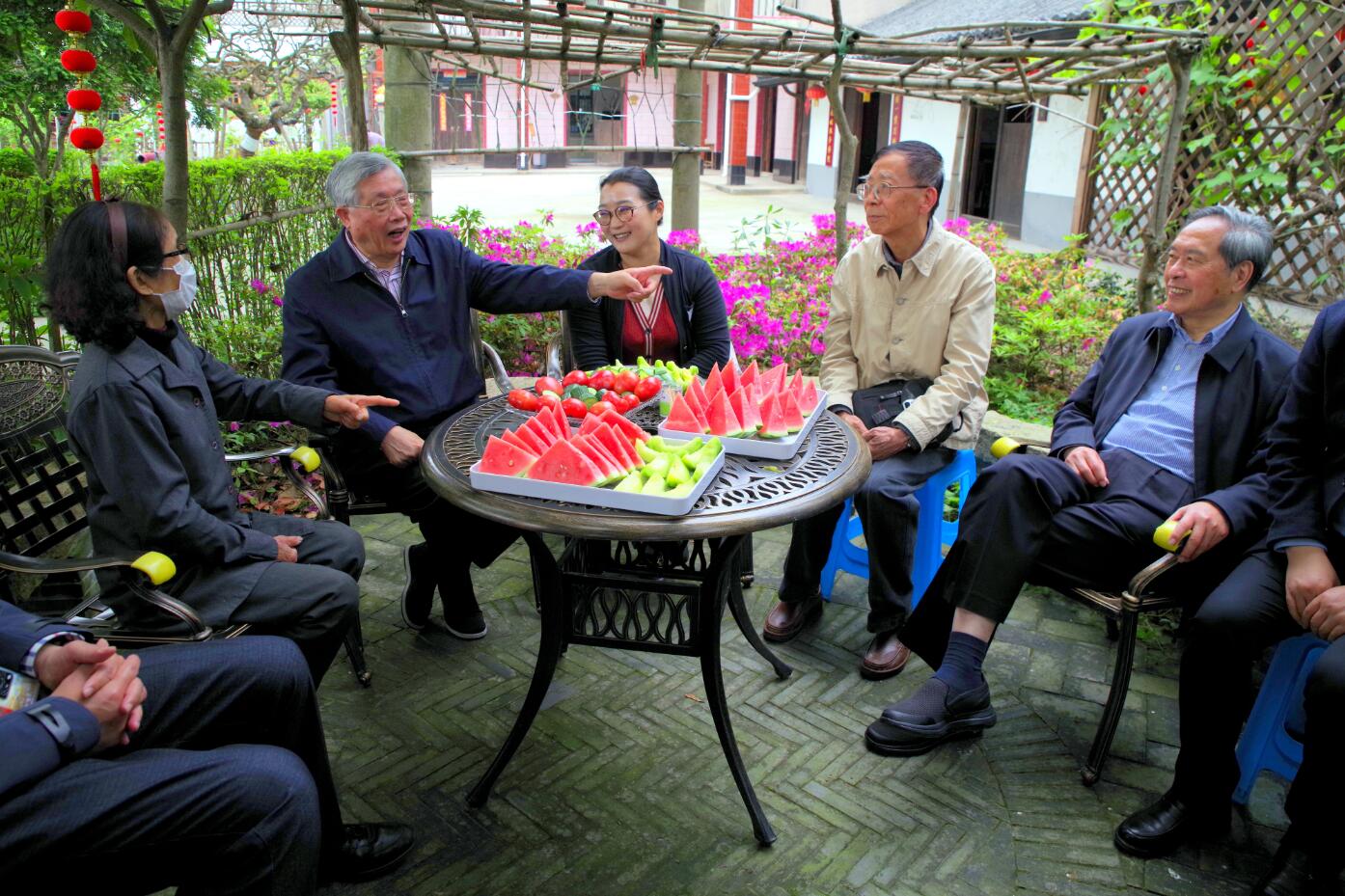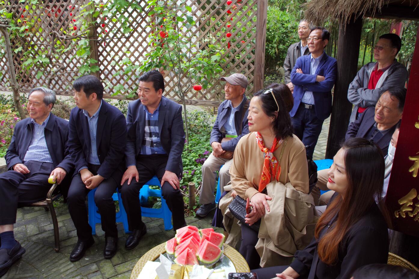 大家随后来到曾获“全国最美家庭”称号的陈氏老宅。陈氏老宅也是该村美丽乡村建设示范点之一:“知青岁月”、“万福诊所”、“公平学堂”、“农耕文化陈列室”等都在这个院落之中。在葡萄架下,大家在村党总支书记陈琪陪同下与陈氏老宅的传人就新农村建设等话题进行了交流讨论,并与陈氏家人合影留念。学习考察活动得到泥城镇党委的大力支持。柴会长与泥城镇党委书记王国娟等镇领导进行了亲切交流。