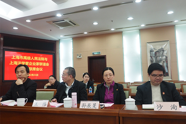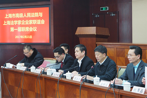 2017年2月21日下午,上海市高级人民法院与上海法学家企业家联谊会第一届联席会议在上海高院召开。双方就当前经济新常态下,如何进一步完善产权司法保护制度、依法保护产权,从而推进供给侧改革,促进上海国际经济中心、国际金融中心、国际航运中心和国际贸易中心建设等热点话题进行了深入座谈交流。上海高院院长崔亚东、上海法学家企业家联谊会会长柴俊勇出席会议并讲话。