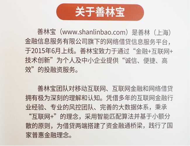 2013年初,善林(上海)金融信息服务有限公司成立于2013年初,前身为高通盛融投资基金管理有限公司。通过对现有组织架构重新规划,高通盛融将原有部分业务划分到善林金融。