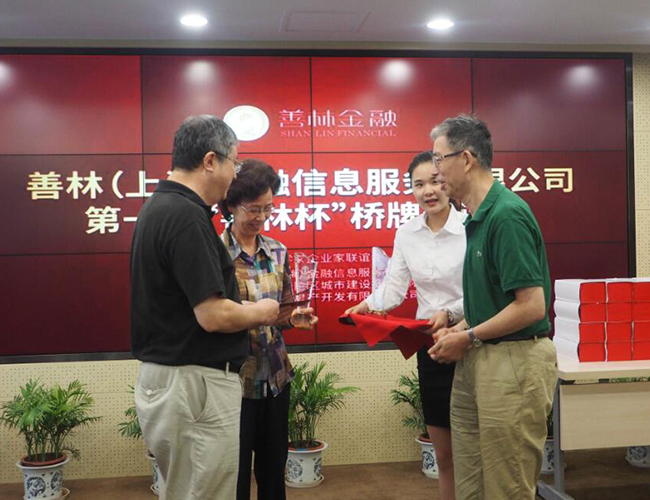 在组办方的精心布置下,普陀城投总部四楼会议室布置一新。整个会场蒙上一片丰收而辉煌的色彩,在一片祥和的气氛衬托下,巨幅标语“‘善林杯’桥牌邀请赛”分外醒目。下午1时许,多方代表应邀前来,整个会场立被浓浓的喜庆所包围。善林(上海)金融信息服务有限公司董事长,上海法学家企业家联谊会副会长周伯云参加了本次活动,并在会上致词。