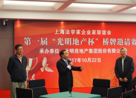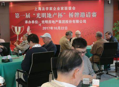 10月22日,由上海法学家企业家联谊会主办,光明地产集团股份有限公司承办的第一届“光明地产杯”桥牌邀请赛在集团总部举办,吸引了来自企业及社会各界人士近40人参加。集团领导吴智荣,张智刚以及上海法学家企业家联谊会会长柴俊勇先后致词和讲话。