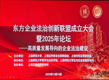 2025年12月14日,由上海师范大学、上海法学家企业家联谊会、上海市司法学研究会联合主办,上海师范大学哲学与法政学院、上海师范大学法与社会发展研究所承办,上海汉盛律师事务所协办的“东方企业法治创新联盟成立大会暨2025年论坛”在上海师范大学徐汇校区顺利召开。出席本次成立大会与论坛的领导、专家和嘉宾有:上海市司法局党委委员、副局长刘言浩,上海师范大学党委副书记、副校长朱惠军,上海法学家企业家联谊会副会长兼秘书长米振荣,上海市司法学研究会副会长、华东政法大学发展规划处处长、教授李翔,以及复旦大学、上海财经大学、上海师范大学、上海社会科学院法学所、杭州电子科技大学、上海浦东软件园、华住集团、美的集团、申通快递、新虹桥公证处等教学研究机构、大型企业法务部门、法律服务机构的专家近50人。